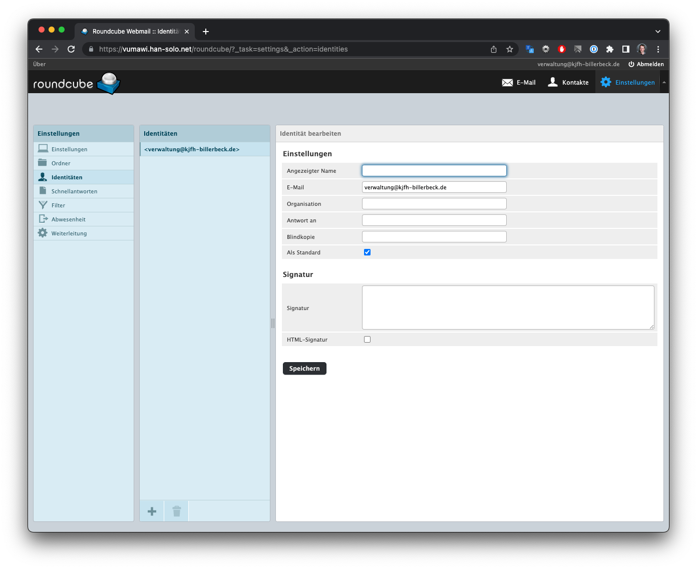 Auf dieser Seite findet man links die Auswahl Identitäten und rechts daneben nach dem Klick auf die E-Mail-Adresse die Möglichkeit die Identität zu bearbeiten. Die Daten dort sollten mit dem angezeigten Namen, der Organisation und der persönlichen Signatur ergänzt und gespeichert werden.