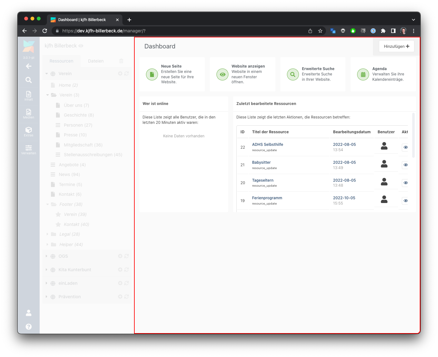 Diese Tabelle zeigt die letzten bearbeiteten Ressourcen. In der Spalte Aktionen lässt sich eine Ressourcen bearbeiten oder ein Überblick der Ressource anzeigen.