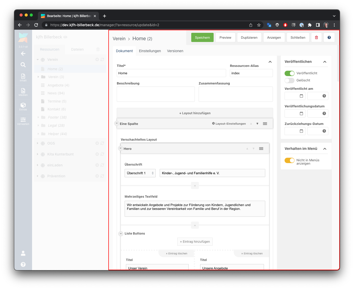 - Nicht in Menüs anzeigen: Wenn der Schalter orange eingefärbt ist, wird die Ressource im Frontend nicht ausgegeben. Sie ist aber trotzdem über ihre URL erreichbar.
